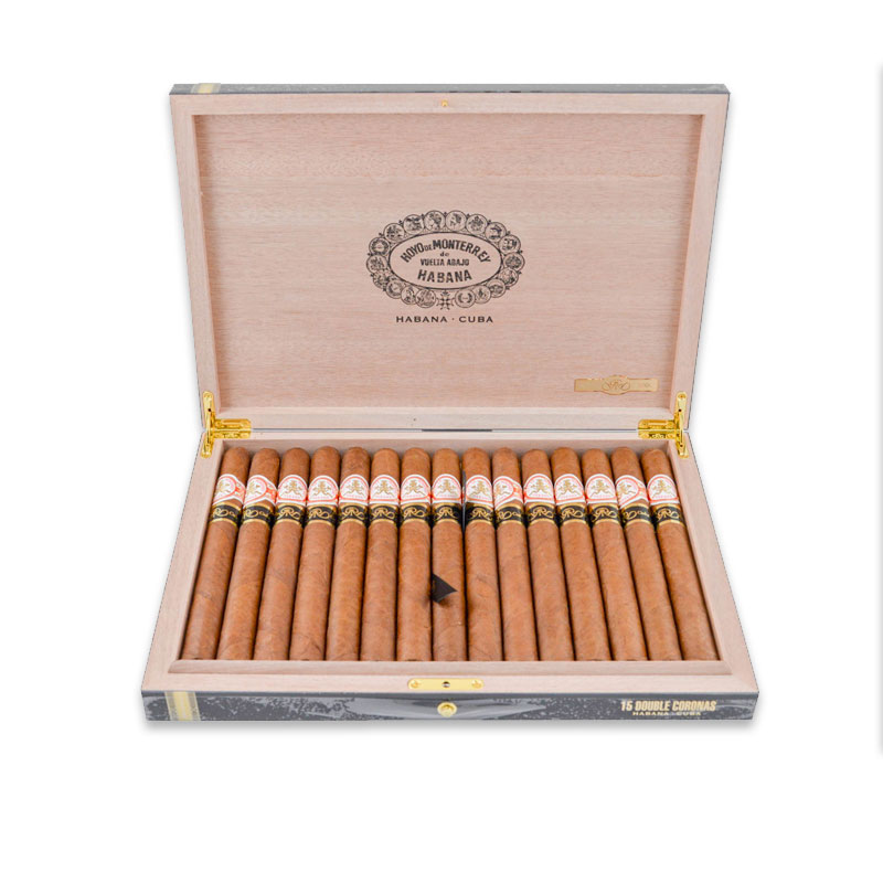 The Gran Reserva cigars are made with carefully selected tobacco leaves that have undergone a fermentation process of at least five years This new vintage is made with the leaves harvested in 2013: Cosecha 2013. The Hoyo de Monterrey Double Corona is dressed with a second black and gold band having the initials G and R stamped all over it. The production of the Hoyo de Monterrey Double Corona Gran Reserva is limited to 5,000 boxes of 15 cigars only.